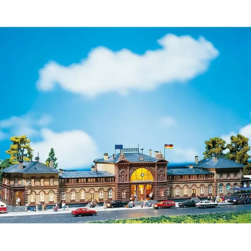 This is Faller 110113 Passenger station Bonn. Many accessories which realistically enliven the appearance of the station such as: route indicators, loudspeakers, clocks, wastepaper bins, train-formation indication boards, benches, timetable boards, illuminated kiosk, luggage lockers, ticket offices and various advertising signs. Particularly interesting effects result by illuminating the centre reception building.