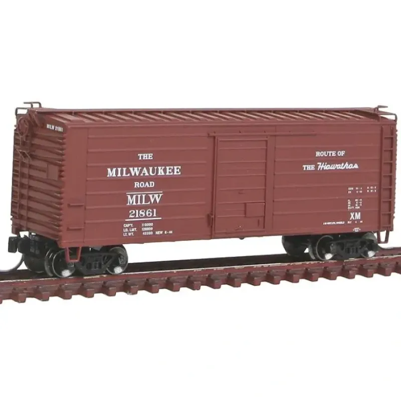 This is a Fox Valley Models 282-90224 N Scale Short-Rib 40′ Rib-Side Boxcar – Ready to Run Milwaukee Road #21818 (Boxcar Red, Hiawathas Slogan). This car features a durable plastic construction, metal wheels, plastic axles, plastic trucks & knuckle couplers.
