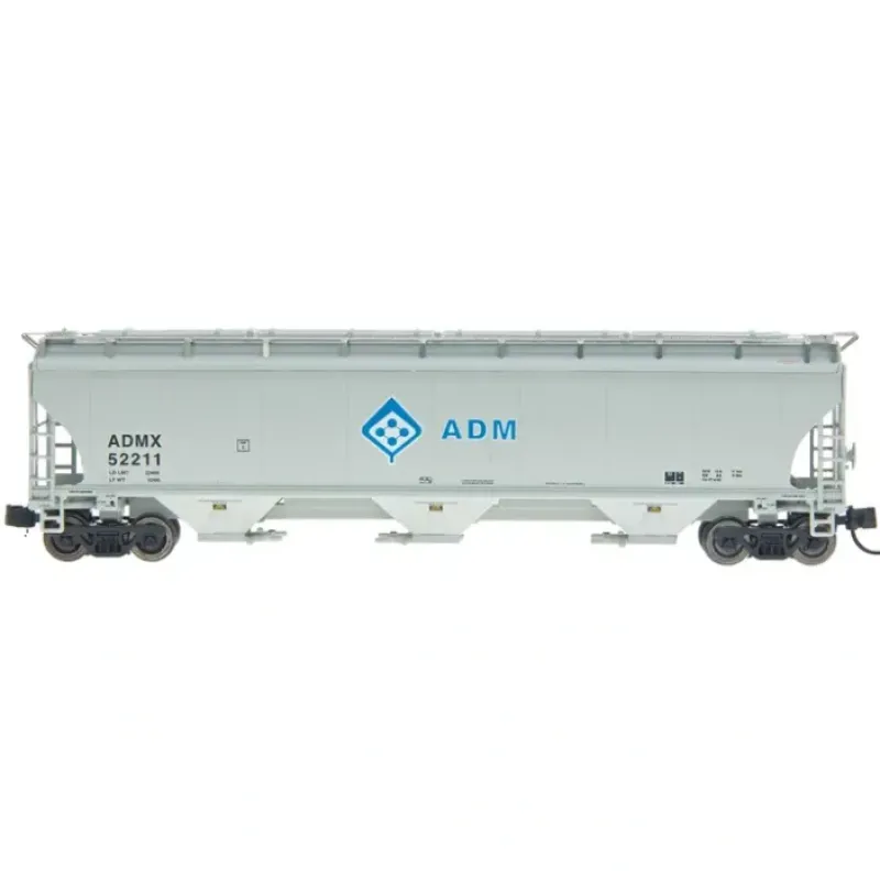 This is a Intermountain Railway Company 85-67209 N Scale Cubic Foot 3-Bay Covered Hopper. The car is painted gray with black lettering. The logo is blue.