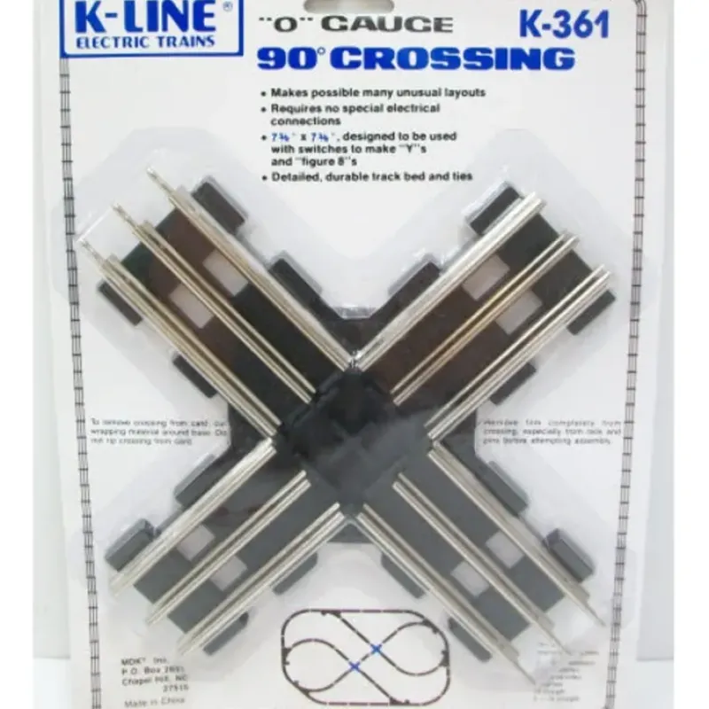 This is a K-Line K361 O 90 Degree Crossover. Features include detailed durable track bed and ties, requires no electrical connections, and measures 9″ across.