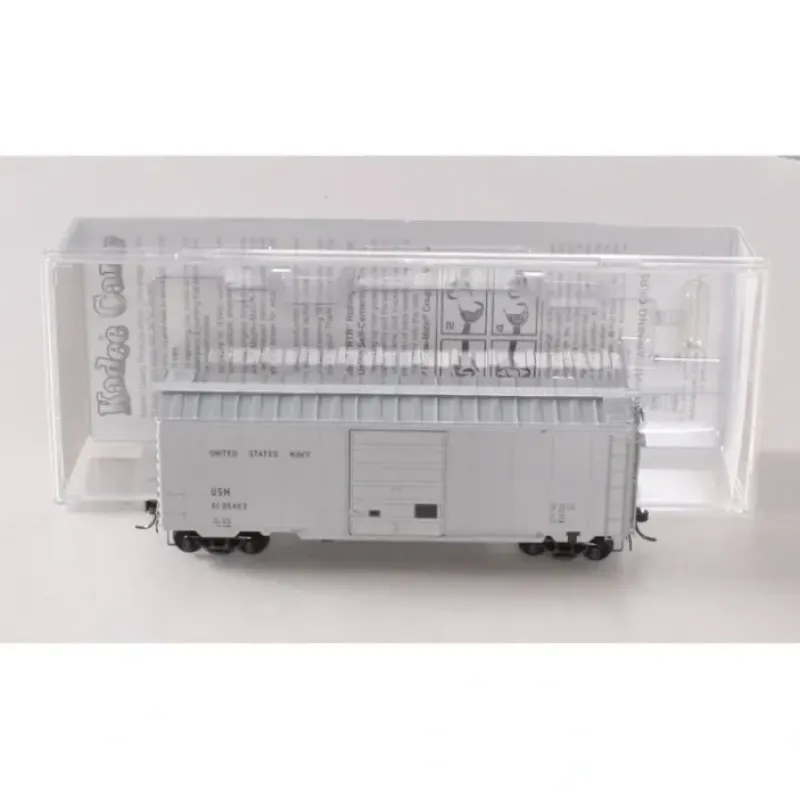 This is a Kadee 5275 HO Scale 40′ PS-1 Boxcar with 8′ 6 Panel Door United States Navy #61-06463 (silver). One of the most popular box cars on America’s rails, thousands were built in the 1950s as railroads began replacing worn-out older equipment. The rugged all-steel construction insured a long service life well into the 1980s. These superbly detailed HO Scale models come fully assembled, ready for service. Each includes a one-piece, injection molded body mounted on a metal floor. Separate details are already installed and include: see-through roofwalk, sliding doors (correct style for the prototype car), latches, grab irons, ladders and brake gear. Each rides on Kadee(R) trucks with patented self-centering action for ease of placement on the tracks. Scale draft gear boxes include delayed centering action Magne-Matic(R) metal couplers. Models feature a riveted roof.