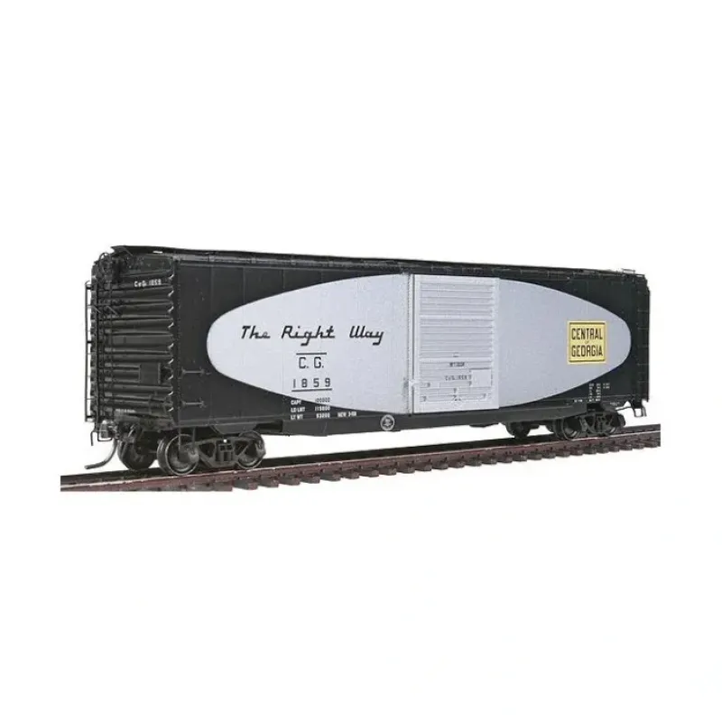 This is a Kadee 6208 HO Scale PS-1 50′ boxcar with 9′ door, Central of Georgia #1859 (football scheme, black, silver), ready to run. Built 1956. Its key features are: Finely detailed grab iron, ladders, stirrups, handrails, see-through roofwalk and brake step Accurately detailed brake wheel with proper curved contour, ribbing and outline highlighting the brake rigging and chain Accurately detailed herals, legible and prototypical lettering and coloring Includes Kadee magne-matic scale metal couplers with delayed magnetic uncoupling and scale draft gear box for accurate, reliable coupling that lasts and lasts N.M.R.A. standard weight, low center of gravity for optimum operating performance Kadee smooth rolling wheels and trucks with self-centering action Limited production piece Made in the USA