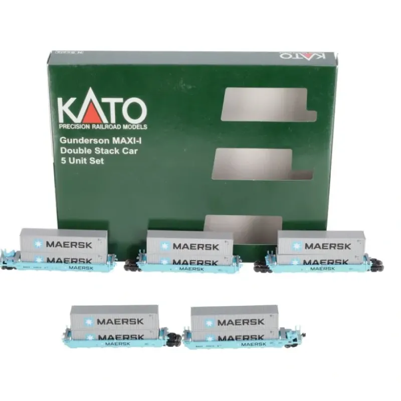 This is a Kato USA Inc 1066191 N Scale Gunderson Maxi-I 5-Unit Double-Stack Well Car w/ 10 40′ Containers Ready to Run Maersk #100010 (blue, white, black w/silver Maersk Containers). Model Features: Stable operation with or without container loads due to Katos innovative heavier material steel compound plastic used for the construction of the well cars. Each container has a magnet and a metal plate to hold it securely to the well car bottom or to the top of the lower Kato container. The MAXI-I has resilient plastic connectors between the wells that allow for easy connecting and disengaging for both operation and storage. Each Maersk MAXI-I Articulated well car consists of five wells and includes 10 MAERSK 40′ Magnetic Intermodal Containers.