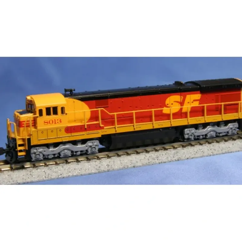 Here is a Kato 176-0941 N SPSF Kodachrome C30-7 Diesel Locomotive #8013. Kato introduced this model in December of 1994. They recycled the mechanism from their U30C of 1989. It is a typical “2nd generation” locomotive featuring some modern features like a split frame and flywheels. It also was constructed with Kato’s “low friction drive” which meant a smooth running quite locomotive with excellent pickup. In 2011, Kato re-tooled this model and introduced a new frame that can support a drop-in decoder. The shell also comes with Kato knuckle couplers and full pilots. The shells of the two versions are *mostly* identical.