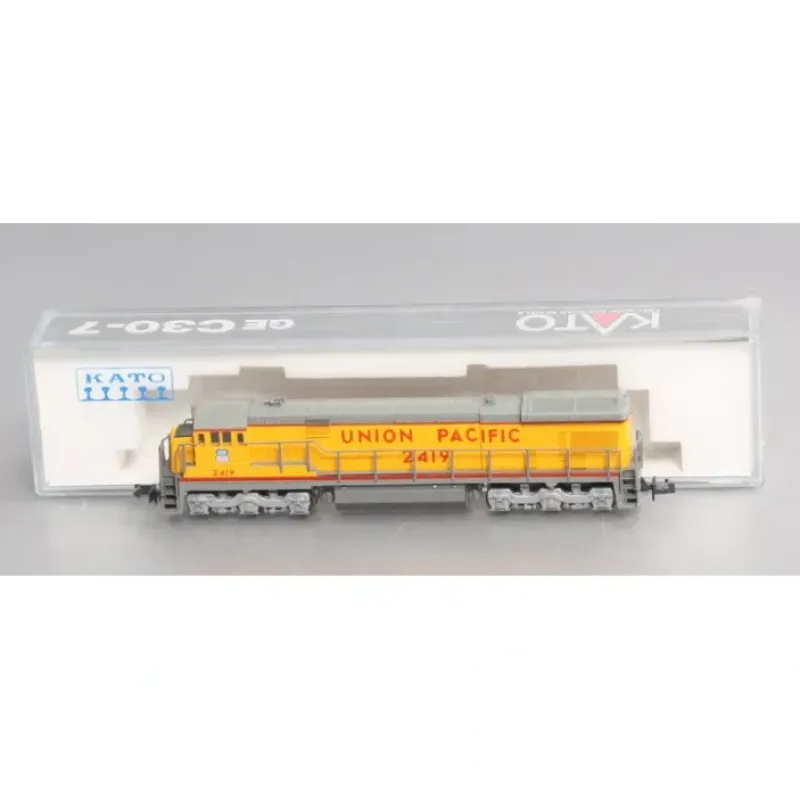 This Kato 176-30C N Scale Union Pacific C30-7 Diesel Locomotive #2419 features a powerful motor, all wheel drive, operating lights, six wheel trucks, decorative horns, and extra detail. Kato engines have a reputation for great performance at slow speeds.