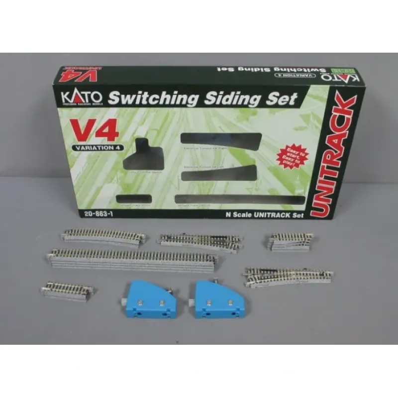 This is Kato 20-863-1 V4 Switching Siding Set. This is a V4 switching siding set includes switching siding with 2 #4 turnouts, switch controllers, and straight track), and two drop tracks. It provides an ideal companion to the V3 rail yard set.