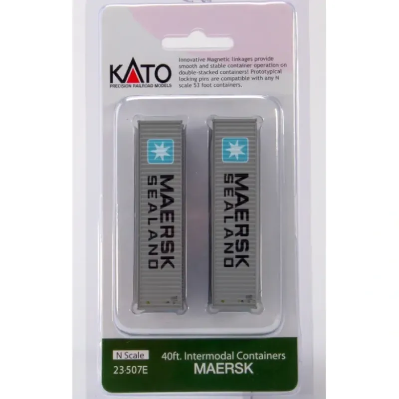 This is Kato 23-507E Maersk (2) N 40′ Container. 40 foot containers are easily interchangeable between MAXI-IV Well Cars and intermodal Yard/Over-the-road tractor trailers. They can also look great in a container yard on your layout! Set includes 2 40′ MAERSK magnetic intermodal containers.