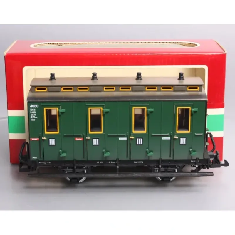 This is an LGB 3050 G European 4-wheel Lighted Passenger Car w/Metal Wheels. Features include opening doors, plastic trucks, plastic latch couplers, and metal wheels and axles. It measures approximately 9 1/2 inches in length.