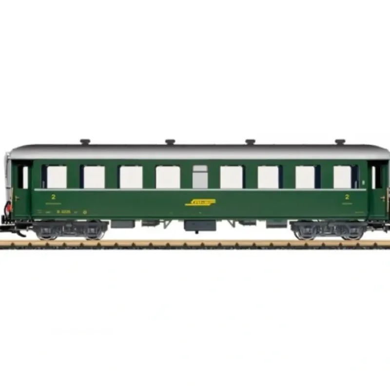This is LGB 32521 G RhB Passenger Car, 2nd Class, Car Number B 2225. For many years, the so-called steel cars formed the image of the RhB express passenger trains. This is a 2nd class car with prototypical paint and lettering. It has metal wheel sets and interior lighting. Length over the buffers 66 cm / 26.
