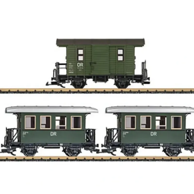 This is a LGB 39079 G Scale Franzburger Kreisbahn 3-Car Passenger Set – Ready to Run German State Railroad DR (Era III, green, silver).