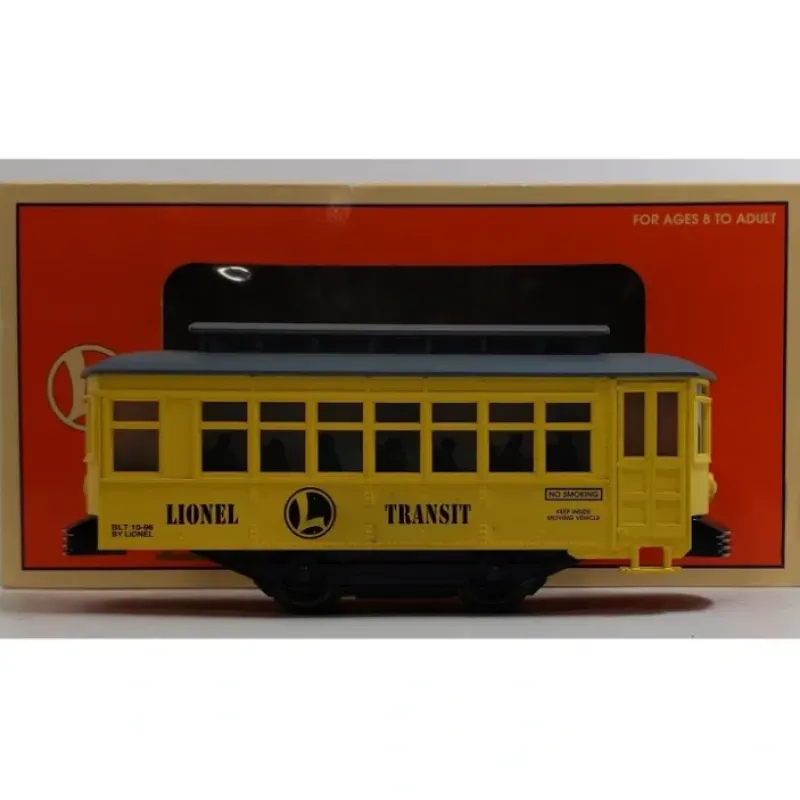 Here is a Lionel 6-18431 O Gauge Lionel Transit Trolley Car from 1996. It has interior illumination, direction controlled headlights and bumper operated reversing. It will run on O27 and O Gauge track.