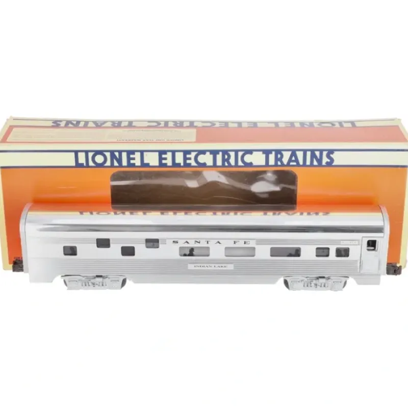 Here is a Lionel 6-19138 O Gauge Santa Fe “Indian Lake” Aluminum Duplex Roomette Car from 1995. This car is part of the Santa Fe Super Chief set from that year, considered by many one of the most handsome Lionel sets of all time. It features an aluminum body, an illuminated interior with passenger silhouetted windows, die-cast trucks with operating metal couplers and it measures 15 inches long.