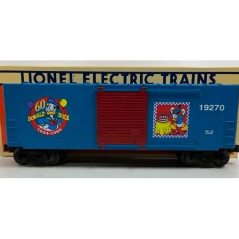 Here is a Lionel 6-19270 O Gauge Donald Duck 60th Birthday Boxcar. This boxcar features sliding doors, die-cast metal sprung trucks, die-cast metal operating knuckle couplers, metal wheels and axles.