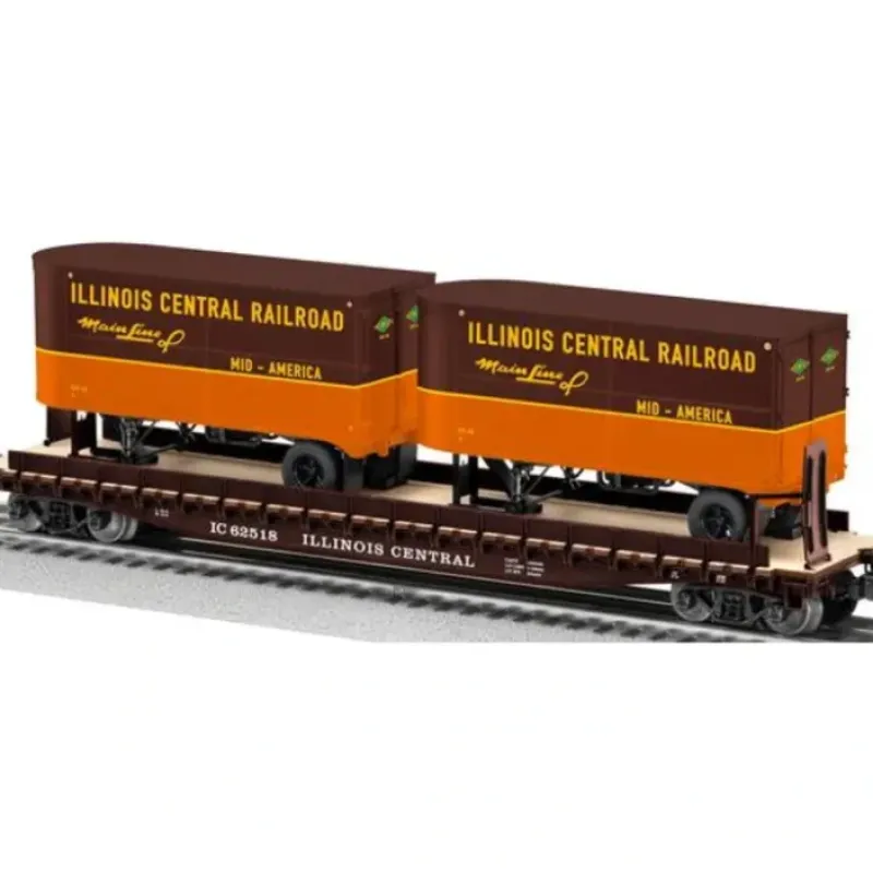 This is Lionel 6-27066 O Gauge Illinois Central Flatcar w/ Piggyback Trailers #62518. Newly tooled Semi-Tractors by Lionel to haul your 1940s and 50s trailers! These realistic, die-cast metal vehicles are the perfect addition to scale PS-4 Flatcars and highly detailed Piggyback Trailers.