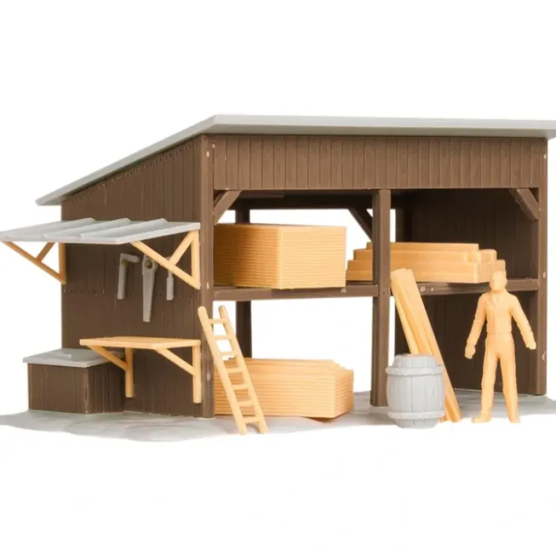 This is a Lionel 6-81629 O Lumber Shed Kit. Features includes unassembled – some assembly required (requires liquid cement| not included). Includes figure| barrel| various wood loads, ladder.