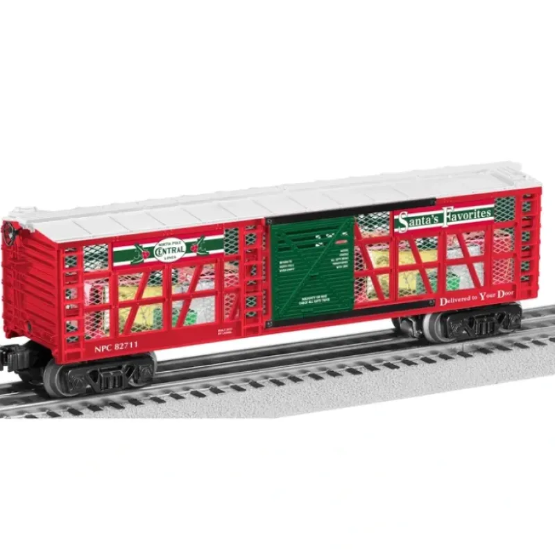 This is a Lionel 6-82711 O North Pole Central Transparent Boxcar w/Christmas Gift #82711. Features includes die-cast metal trucks and operating couplers, interior illumination, worker figure inside car, load of presents in interior, opening doors.