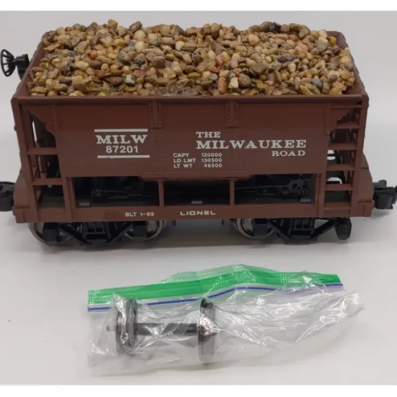This is a Lionel 87201 Milwaukee Road Ore Car. This car features plastic trucks, plastic operating knuckle couplers, a lever that operates the opening hatches and metal wheels and axles.