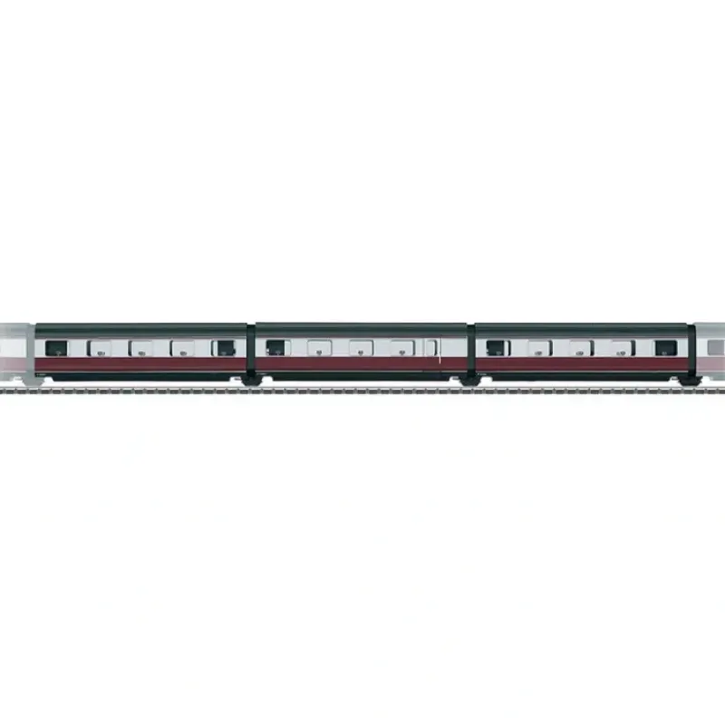 This is a Marklin, Inc 41101 HO Scale Passenger 3-Car Add-On Set for Senator 39101 – 3-Rail – Ready to Run German Federal Railroad DB Intermediate Cars c, f & d (Era III 1955). This car set is for lengthening the 39101 train to the prototypical 7-car train. There is a special multiple conductor current-conducting coupling and close fitting diaphragms between the cars. The cars have factory-installed interior lighting and lighted table lamps powered and controlled from the powered end cars. The lights are maintenance-free warm white LEDs. This car set lengthens the train by 42.0 cm / 16-9/16.