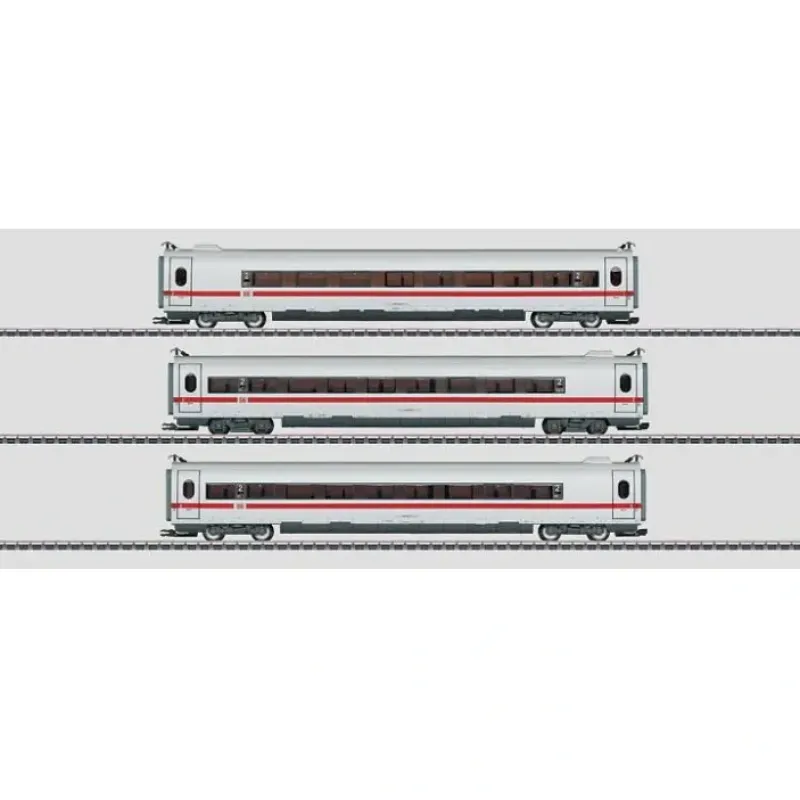 This is a Marklin, Inc 43735 HO Scale ICE 3 Passenger 3-Car Add-On Set – 3 Rail – Ready to Run German Railroad DB AG (white, orange).Prototype: 2 each transformer cars, 2nd class, and 1 each intermediate car, 2nd class. Add-on cars for the German Railroad, Inc. (DB AG) ICE 3. The cars look as they currently do in 2011, Era VI. Model: These 3 intermediate cars are add-on cars for the 37788 ICE 3. The cars have special close couplings with guide mechanisms. The interior lighting is powered from the continuous electrical connection through the entire train. Total length 83.7 cm / 32-15/16. Highlights: Factory-installed interior lighting with warm white LEDs.