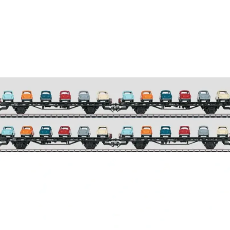 This is a Marklin, Inc 45098 HO Scale Sm 24 Flatcar 4-Pack w/Goggomobil Loads – 3-Rail – Ready to Run German Federal Railroad DB (Era III 1959, black) – Marklin Exclusiv. Prototype: 4 German Federal Railroad (DB) type Sm 24 interchange design flat cars, as open freight cars for transporting automobiles. Each flat car is loaded with 6 Goggomobil automobiles in different paint schemes. The cars look as they did around 1959. Model: The flat cars have a long wheelbase. The flat car superstructures have restraint equipment for automobiles. All of the flat cars have different car numbers. Each flat car is loaded with 6 models of Goggomobil automobiles from the firm Brekina, in different paint schemes. The cars come individually packaged. Total length over the buffers 63 cm / 24-13/16. DC wheel set per car 2 x 700580. Highlights: Prototypical load. Authentic automobile paint schemes.