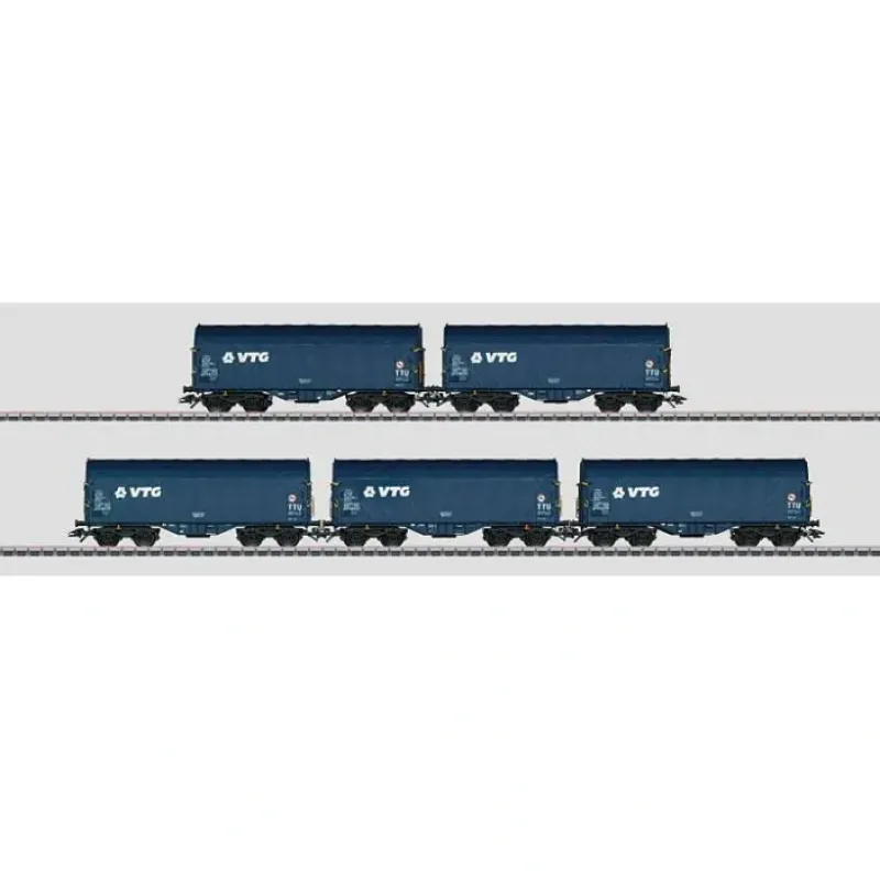 This is a Marklin, Inc 47203 HO Scale Type Shimmns 4-Axle Sliding-Tarp Car 5-Pack – 3-Rail – Ready to Run VTG Hamburg (Era VI, blue, white). Prototype: Type Shimmns freight cars lettered for the firm VTG AG, Hamburg, Germany. The cars look as they currently do in real life. Model: The 5 cars have closed tarps. All of the cars have type Y 25 welded trucks. Each car is individually packaged. Length over the buffers per car 13.8 cm / 5-7/16. Total length over the buffers 69 cm / 27-3/16. DC wheel set per car 4 x 700580.