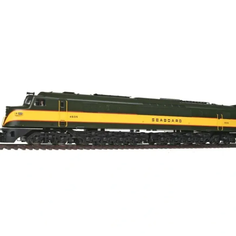This is a Broadway Limited 2097 HO Scale Seaboard Air Line Paragon2 Series Diesel Baldwin Centipede A Unit Powered with Sound DC/DCC #4505 (Freight Scheme). Industry-Leading Features of this Model:The All-New Paragon2 Sound & Control System,Integral DCC Decoder with Back EMF for Industry-Best Slow Speed Operation in DC and DCC,Precision Drive Mechanism engineered for continuous heavy load towing and smooth slow speed operation,5-Pole Can Motor with Skew Wound Armature,PRR A-units are equipped with trainphone antennae. B-units are not.,Premium Caliber Painting with Authentic Paint Schemes,Prototypical Light Operation with Golden White LED Headlight,Operating Kadee Knuckle Couplers,Factory InstAlled Engineer and Fireman Figures,Near-Brass Caliber Detail at a Plastic Price,Minimum Radius: 22 or greater recommended Industry-Leading Sound Features: Operates in DC & DCC (use DCMaster for DC Sound),Auto Pilot (ATS) – Records and plays back Sound and movement for automatic operation (Macro Operation),16-bit Sample Rate for exceptional high frequency Sound clarity,Playback Whistle for multiple whistle lengths and patterns,Choice of 3 selectable Whistles / Horns,Alternate Whistle / Horn where applicable for locomotive with air horn and steam whistle – both the main whistle and alternate can be easily played,Adjustable bell ringing interval for faster or slower bell,Numerous user-mappable functions with available keys,Passenger Station Ambient Sounds – Controlled with Function Key,Freight Yard Ambient Sounds – Controlled with Function Key,Lumber Yard Ambient Sounds – Controlled with Function Key,Farm Ambient Sounds – Controlled with Function Key,Crew Radio Communications – Controlled with Function Key,Maintenance Yard Ambient Sounds – Controlled with Function Key,Demo Mode for display and demonstrations,Grade Crossing Automatic Signal,8 Diesel Motor Revs (Diesel Only),Simple Programming with Integral DCC Decoder,Automatic Forward / Reverse Signal – When activated, stopping triggers and stop whistle toot. When moving forward from a stopped position, toots twice. When moving in reverse. toots three times.,Engine Sound intensity varies with load,IndividuAlly adjustable Sound volumes for each effect,EZ Reset Button for quick return to factory default settings.