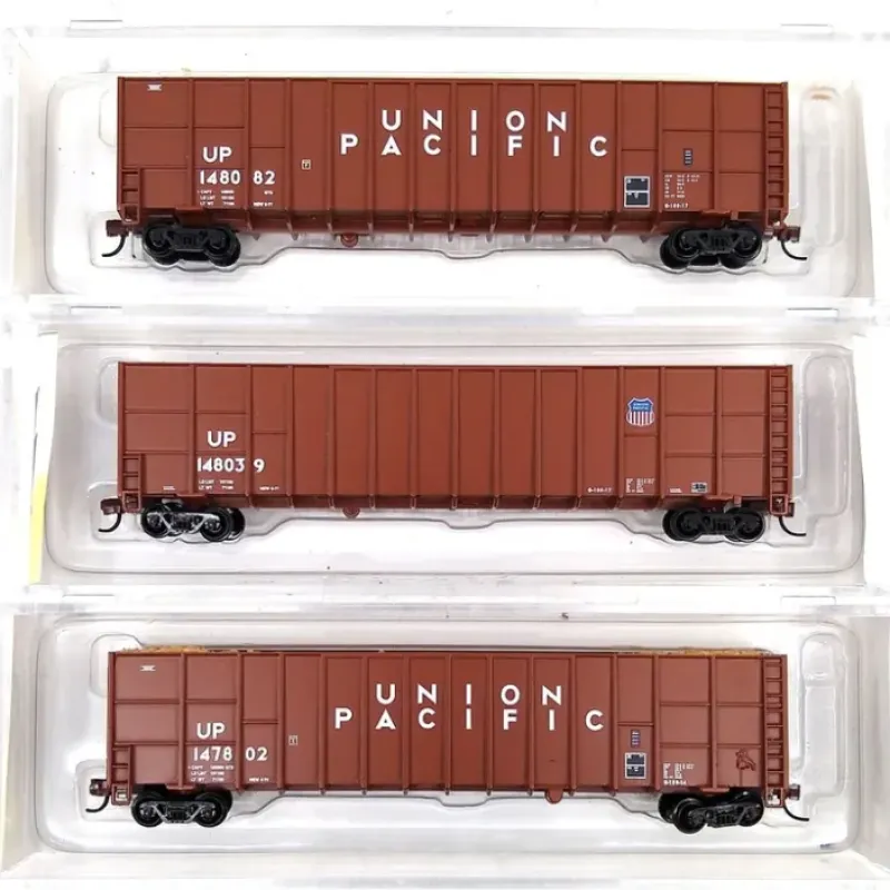 This is a Deluxe Innovations 238-100223 N Scale Gunderson Deep-Rib Wood Chip Gondola 3-Pack – Ready to Run Union Pacific #148082, 148039, 147802
