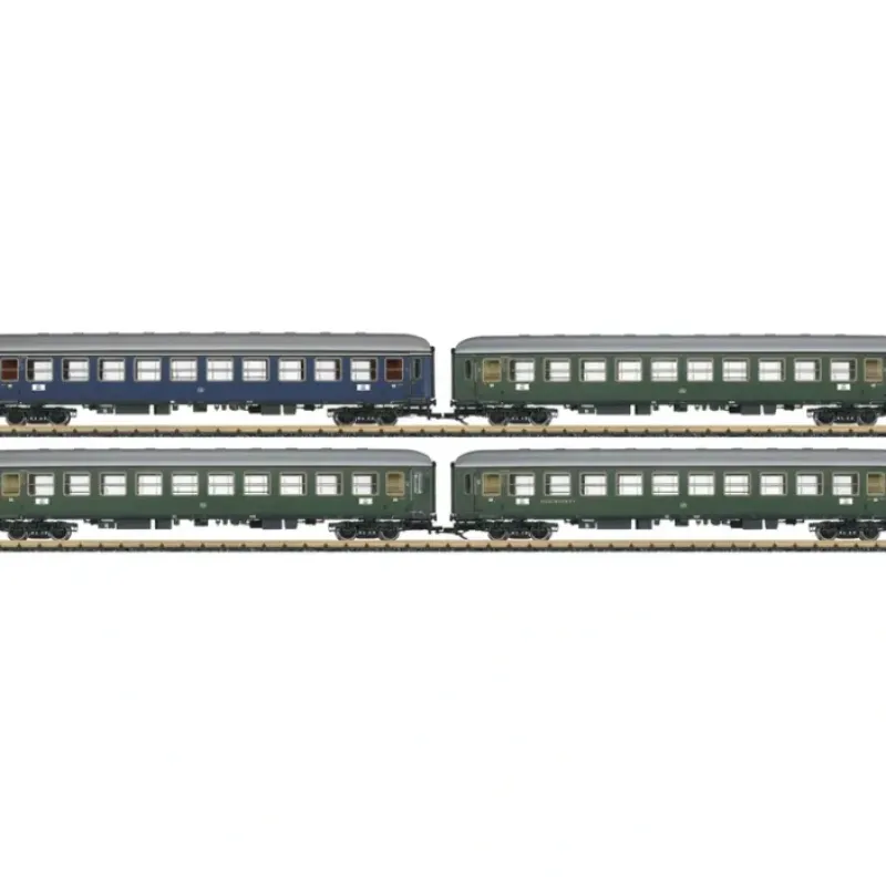 This is a LGB 39310 G Scale German Federal Railroad DB Era III 4-Car Passenger Set – Ready to Run 2 B4um-63 2nd Class, 1 A4um 61 Compartment & 1 BRbu4um Half Diner.