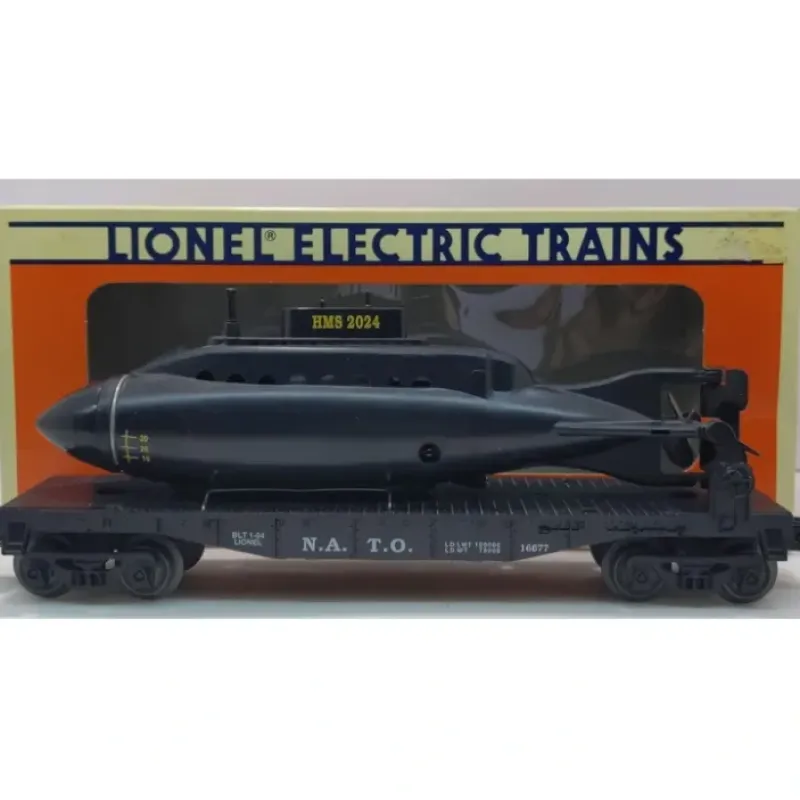 Here is a Lionel 6-16677 O Gauge NATO Flatcar with Royal Navy Submarine. The submarine is removable and will work in a pool or bathtub. The car features operating couplers and plastic trucks.