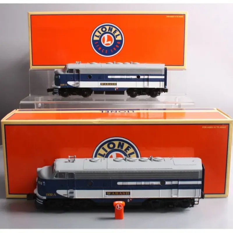 This is a Lionel 6-38712 O Scale Wabash F-7 A-A Diesel Locomotive #1102-A, #1107-A (Set of 2). Set Includes: One powered A-unit, One non-powered A-unit. Both Units: Fan-driven smoke unit, Adjustable smoke output in LEGACY Control or TMCC mode, Directional lighting including LED headlights, Front ElectroCouplers, Die-cast metal trucks, pilot, and fuel tank, High level of separately applied metal details, Cab window glass, Illuminated number boards, Operating marker lights on front, Illuminated cab interior. Powered A Units: LEGACY Control System equipped able to run in LEGACY Control mode, in TrainMaster Command Control mode, or in Conventional mode with a standard transformer, Odyssey II Speed Control with On/Off switch. LEGACY RailSounds sound system featuring: CrewTalk dialog and TowerCom announcements, each with different scenarios depending on whether the locomotive is in motion or stopped- Six official railroad speeds with CrewTalk dialog- Eight diesel RPM levels- LEGACY Real-Time Quilling Horn control with instant quilling and correctly timed warning signals- Single hit or continuous mechanical bell sounds- Sequence Control plays the sound effects of an entire trip, including warning sounds and announcements, based on the movement and speed of the locomotive- Current speed and fuel dialog, refueling sound effects, Dual powerful maintenance-free motors with momentum flywheels, Refined Conventional Transformer Control Mode with lower starting speeds, Traction tires, Engineer and conductor figures.