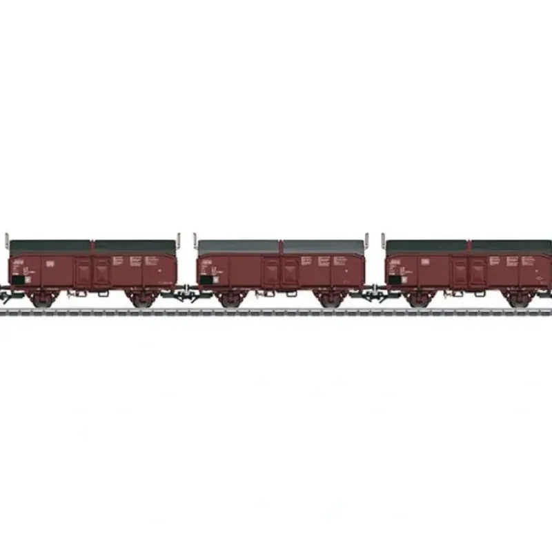 This is a Marklin, Inc 46195 HO Scale Type Bauart Tcms 3-Part Sliding-Roof Boxcar 3-Pack – 3-Rail – Ready to Run German Federal Railroad DB (Era IV, Boxcar Red).Prototype: 3 German Federal Railroad (DB) type Tcms 850 (former Kmmfks 52) sliding roof cars. Version with three-part folding doors on the ends. Model: The roofs can be opened on all of the cars. The cars come individually packaged. Length over the buffers per car 11.5 cm / 4-1/2. DC wheel set per car 2 x 700580. Highlights: Prototypical tooling changes to the ends.