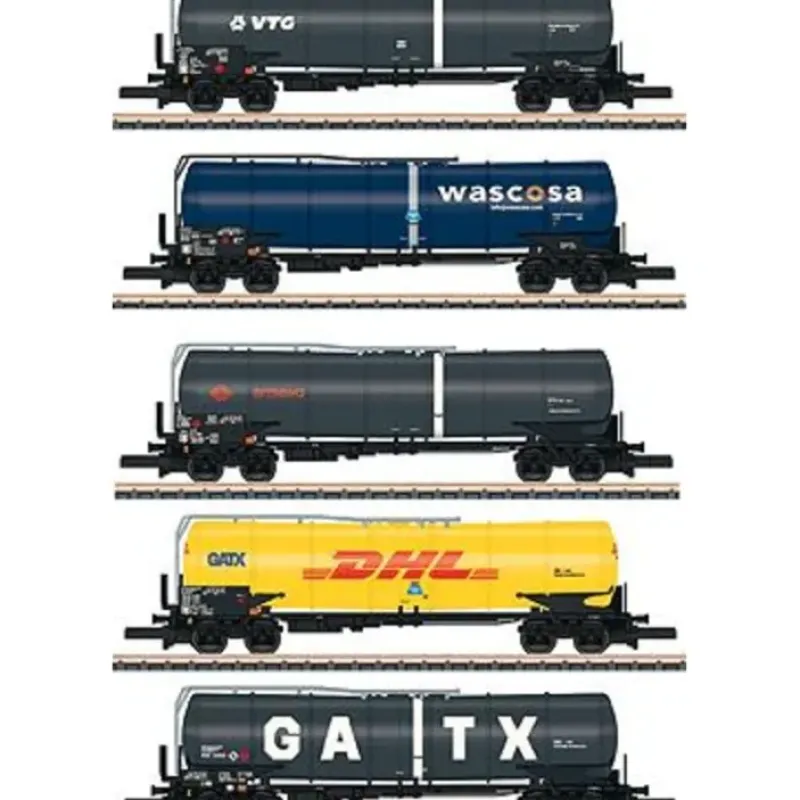 This is a Marklin, Inc 82530 Z Scale Era VI Zans/Zacns Tank 20-Car Set 4 Each: GATX, GATS/DHL, Ermewa, Wascosa & VTG. Display showcases 20 different type Zans/Zacns funnel-flow tank cars. All cars feature completely new tooling plus finescale detailing, painting and lettering.