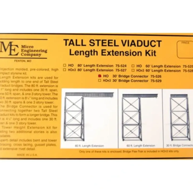 This is a Micro Engineering 75-526 HO Scale 30′ Bridge Connector Tall Steel Viaduct. Tall steel viaducts are some of the most spectacular and interesting types of bridges. They are used by railroads to span wide and/or steep valleys, often replacing wooden trestles. These HO and HOn3 Tall Steel Viaducts are available in three base kits, three length extension kits, a height extension kit which adds a 4th and 5th story, and a tower kit. The various kits allow you to design and build your own custom bridge of any length from one to five stories high, with full towers or bents, and straight or curved. A 10-page instruction sheet with over 35 photos and illustrations is included. These bridges are beautifully detailed and are often the centerpiece structure on modeler’s layouts.