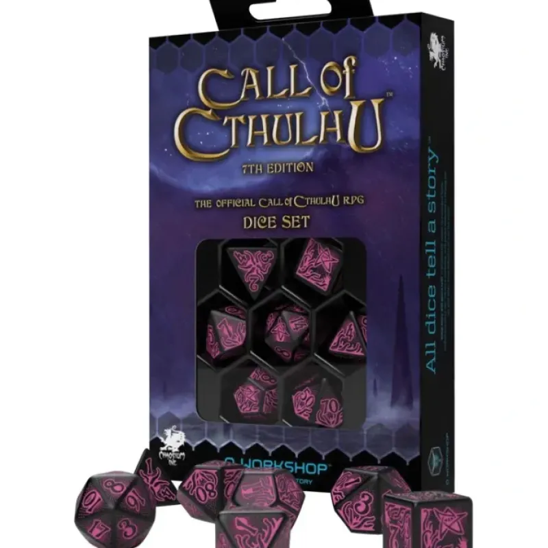 Q WORKSHOP presents The Call of Cthulhu 7th Edition Black & Magenta Dice Set. Made from the best material, these dice are coloured black as the void in the deep cosmos, with the abhorrent tentacles creeping out to reach you, highlighted by the bright magenta reminiscing the color out of space. The highest face is adorned with the Elder Sign, ideal for disturbing Lovecraftian setting.