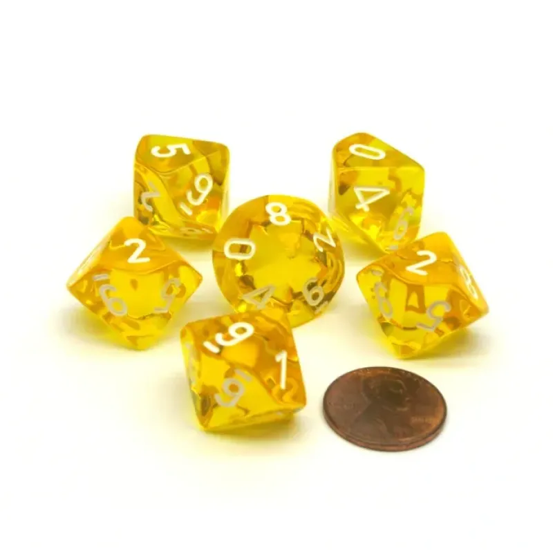 Dice-Translucent 16mm D10 (0-9) Chessex Dice, 6 Pieces – Yellow with White Numbers – Your Source for Gaming Essentials