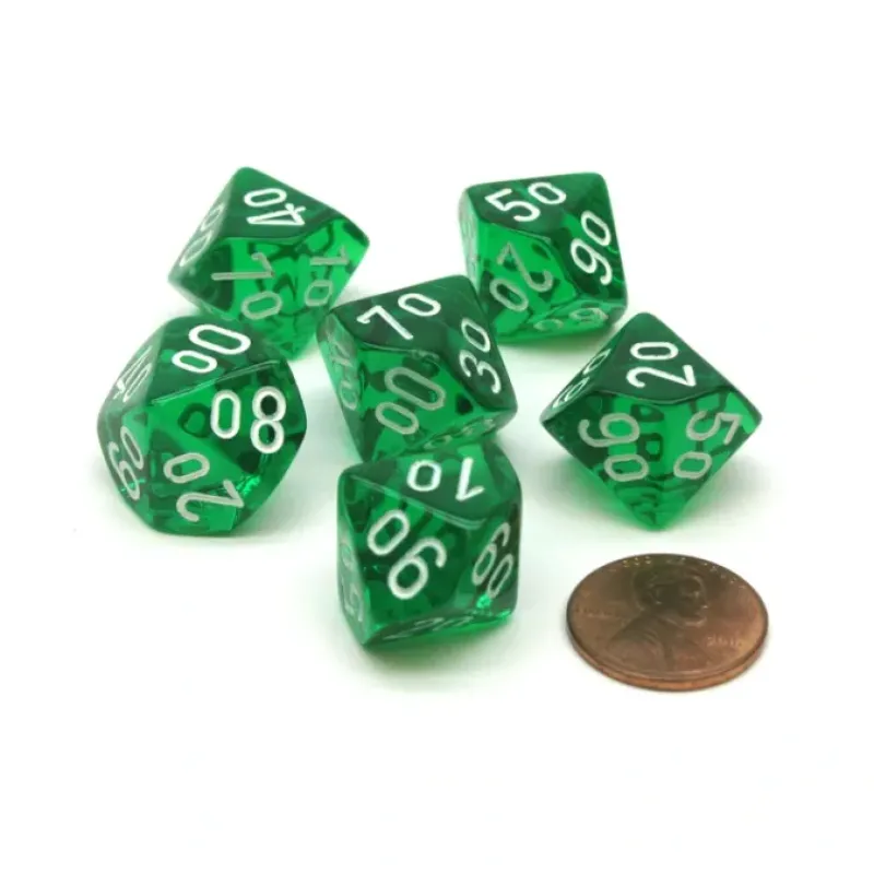 These 10-sided 16mm Translucent ‘Tens’ dice are numbered from 00 to 90 with numbers, not pips, and feel great in your hands. These dice are unique, good quality, and great for any dice game! Numbers are centered on each side. Sides read: 00, 10, 20, 30, 40, 50, 60, 70, 80, and 90.