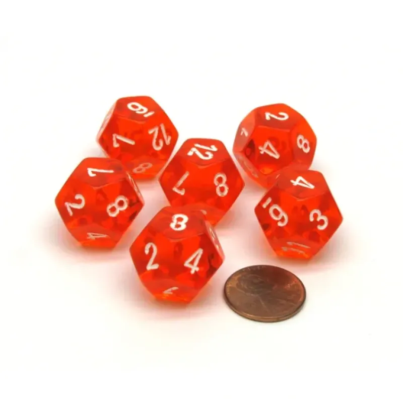 These twelve sided 18mm Translucent dice are numbered from one to twelve with numbers, not pips, and feel great in your hands. These dice are unique, good quality, and great for any dice game! The 6 and 9 have lines under them to help differentiate the two numbers.
