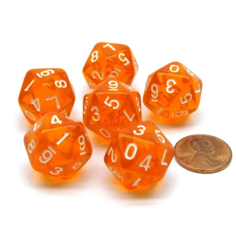 These twenty sided 20mm Translucent, Numbered Twice dice are numbered from 0 to 9 two times, and feel great in your hands. These dice are unique, good quality, and great for any dice game! The 6 and 9 have lines under them to help differentiate the two numbers.