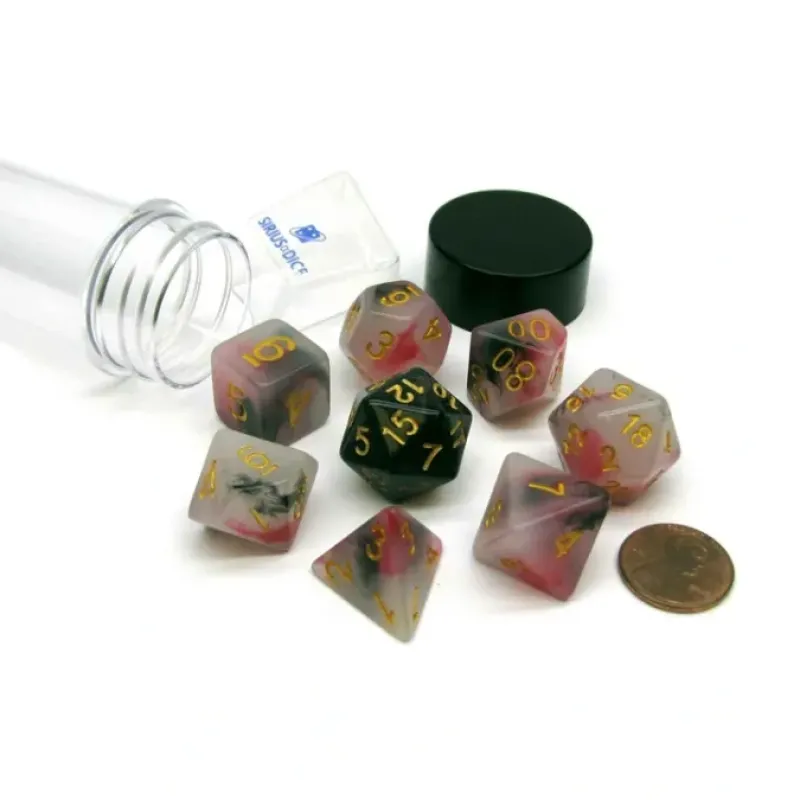 Play your favorite dice and role playing games in style with this 7 piece (plus a bonus D20) polyhedral dice set from Sirius Dice. The dice come nicely packaged in a clear plastic tube with screw on lid for safe storage and display.