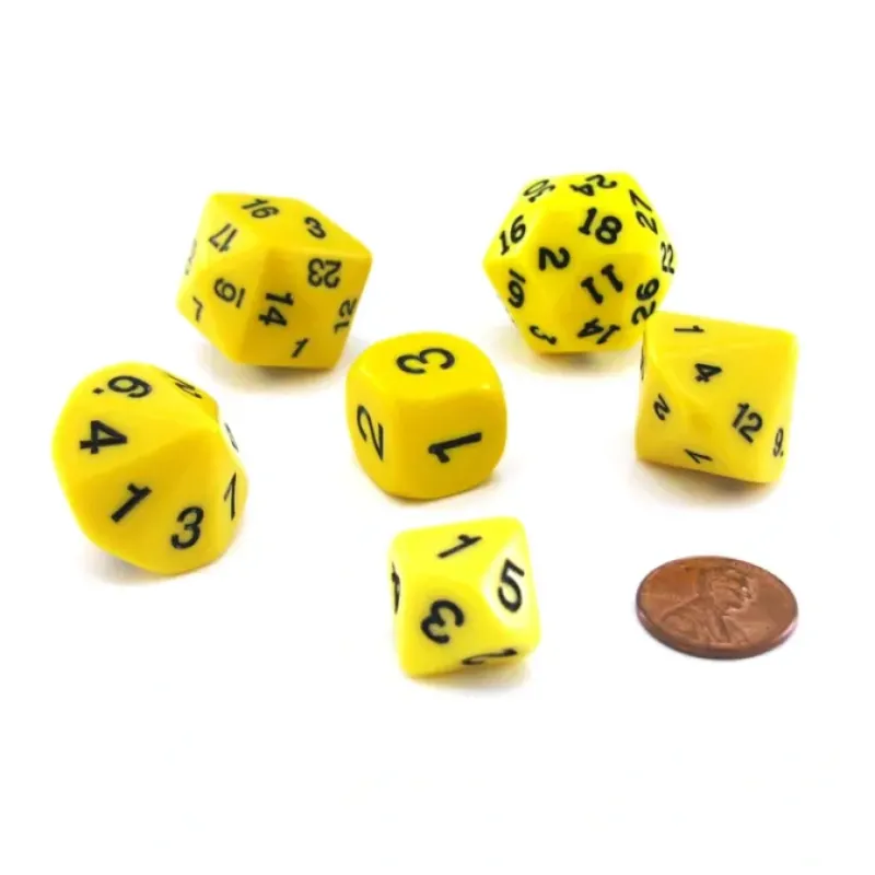 Who Knew opaque dice sets give you a variety of dice in one purchase. This set comes with six dice including a D3, D5, D7, D16, D24, and D30. This solid color set of dice feels great in your hands and is fun to roll! The 6 and 9 have decimals in the lower right corner of their respective sides to help differentiate the two numbers.
