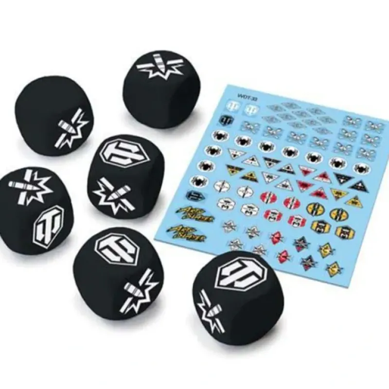 The Tank Ace dice and decal set adds six more attack dice, for when the starter set’s six attack dice just arent enough. Also included is a sheet of decals that match many of the decals found in the online game, so you can customize your miniatures to match your online tanks!