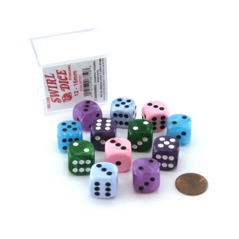 These 12 deluxe ‘Swirl’ dice are numbered from one to six with traditional dice pips etched into the sides and painted. At 16mm tall the dice are considered standard sized. The dice feature smooth round edges, and a high quality swirled effect. Great for any dice game. Includes 12 dice in a clear plastic display case.