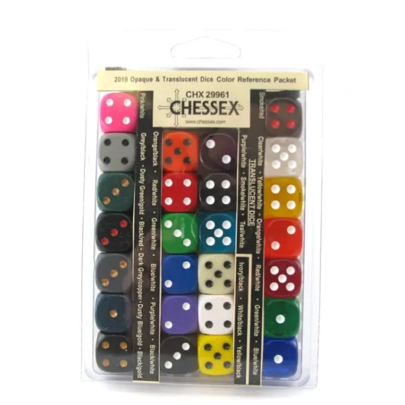 Interested in adding unique colored dice to your collection, then this pack is for you! This Opaque and Translucent Dice Color Reference Packet by Chessex is perfect for anyone looking to see what color dice are available by Chessex (the year referenced on the package may differ, but the dice are the same). This pack includes 10 different translucent dice and 16 different opaque dice, totaling 26 unique dice!