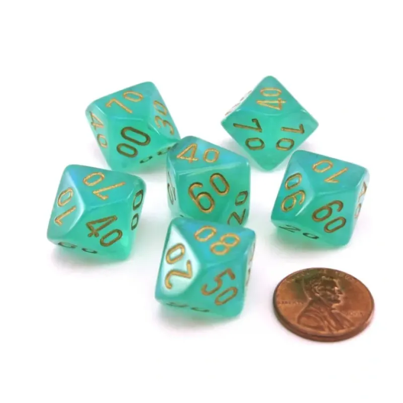 Dice>Luminary Borealis 16mm Tens D10 (00-90) Dice, 6 Pieces - Light Green with Gold - Your Source for Gaming Essentials