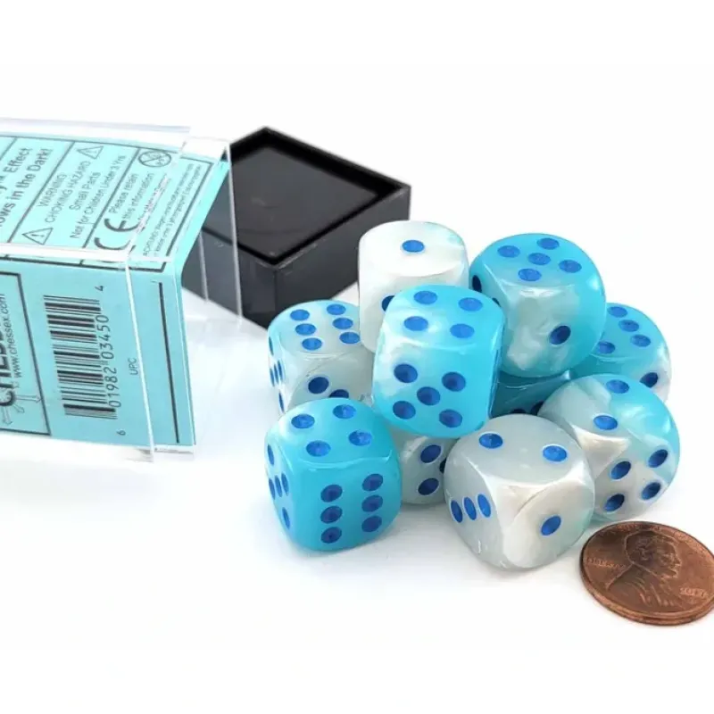Dice>Luminary Gemini 16mm D6 Dice Block (12 Dice) - Pearl Turquoise-White with Blue - Your Source for Gaming Essentials