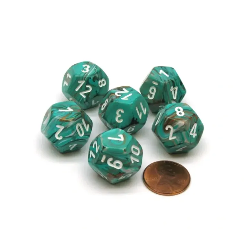 These twelve sided 18.5mm Marble dice are numbered from one to twelve with numbers, not pips, and feel great in your hands. These dice are unique, good quality, and great for any dice game! The 6 and 9 have lines under them to help differentiate the two numbers.