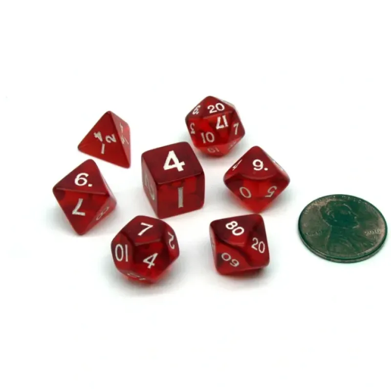 These small dice look, feel, and roll well and will be a great addition to any game or collection. Each die has a nice transparent look, and are red with white numbers painted into the sides. These cute little dice read from the top for easy comprehension. This polyhedral set contains one D20, one D12, two D10 (00-90 and 0-9), one D8, one D6, and one D4. Dice come in a plastic bag.