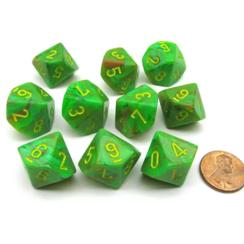 Dice>Pack of 10 Chessex Vortex D10 Dice - Slime with Yellow Numbers - Your Source for Gaming Essentials