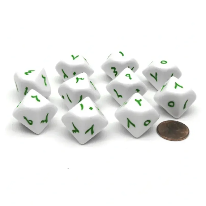 These 10-sided 20mm Opaque dice are numbered from one to ten with green Arabic words, not pips, and feel great in your hands. These dice are unique, good quality, and great for any dice game! Numbers are centered on each side.