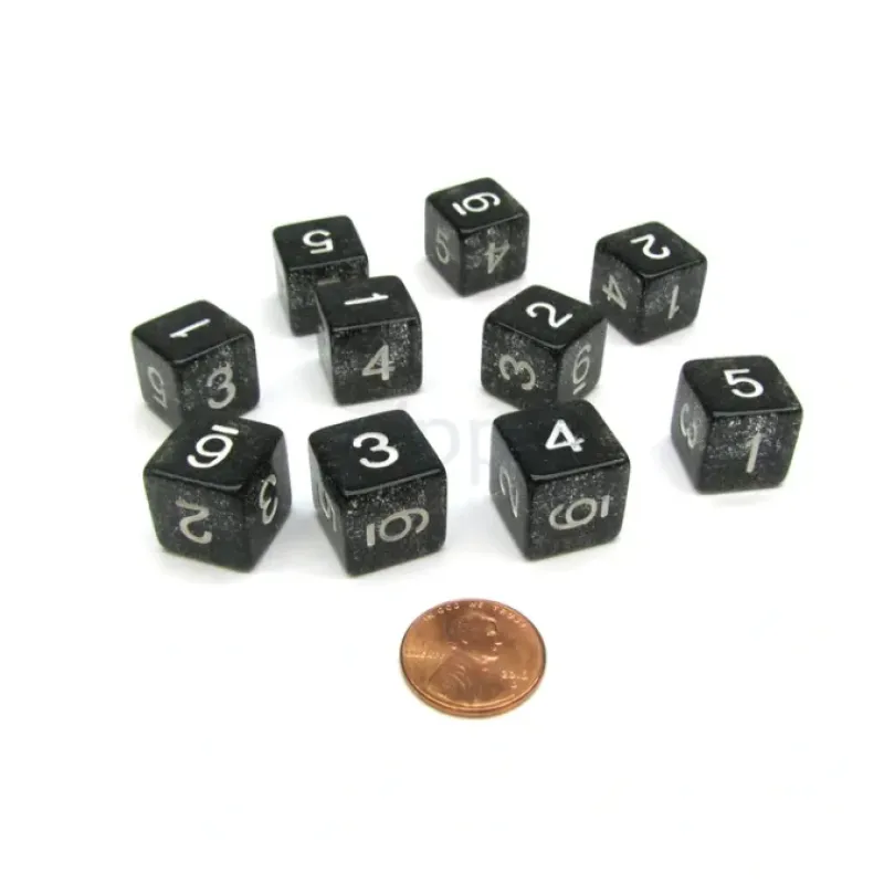 These six sided 16mm glitter dice are numbered from one to six with numbers, not pips, and feel great in your hands. These glitter dice are sparkly, good quality, and great for any dice game!